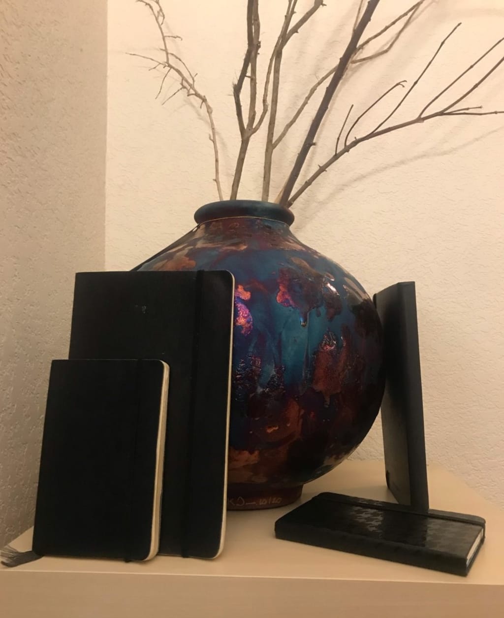 “I opened it up with the full intention of writing down everything I thought I had learned in my life to that point, to honor Emmy’s memory. I sorta believed that if I wrote it in this little black book, she could read it, or hear it. And I opened it up to two blank pages, and wrote down my life, my love, my lessons. All those words are soaked up in here and I can’t find ‘em no more. Don’t need ‘em, now. I’ve got lung cancer, terminal stages they say. Nothing to do with the service, just me bein’ a dumb jackass and smoking my whole damn life, despite what my mom, my wife, and even this book here tried to tell me. So, I ain’t got a use for it anymore. I know my fate, and don’t need any advice on facing it. I was gonna leave it in the street, let someone find it like I did, but I think it would just be thrown away. If it magically turned into a phone I guess somebody would snatch it up quick, but it’s a book, and few care about a book. So, it’s yours. I don’t know if there is a proper way to hand it off or not. I’ll just leave it on the table, and thank you for your time.”