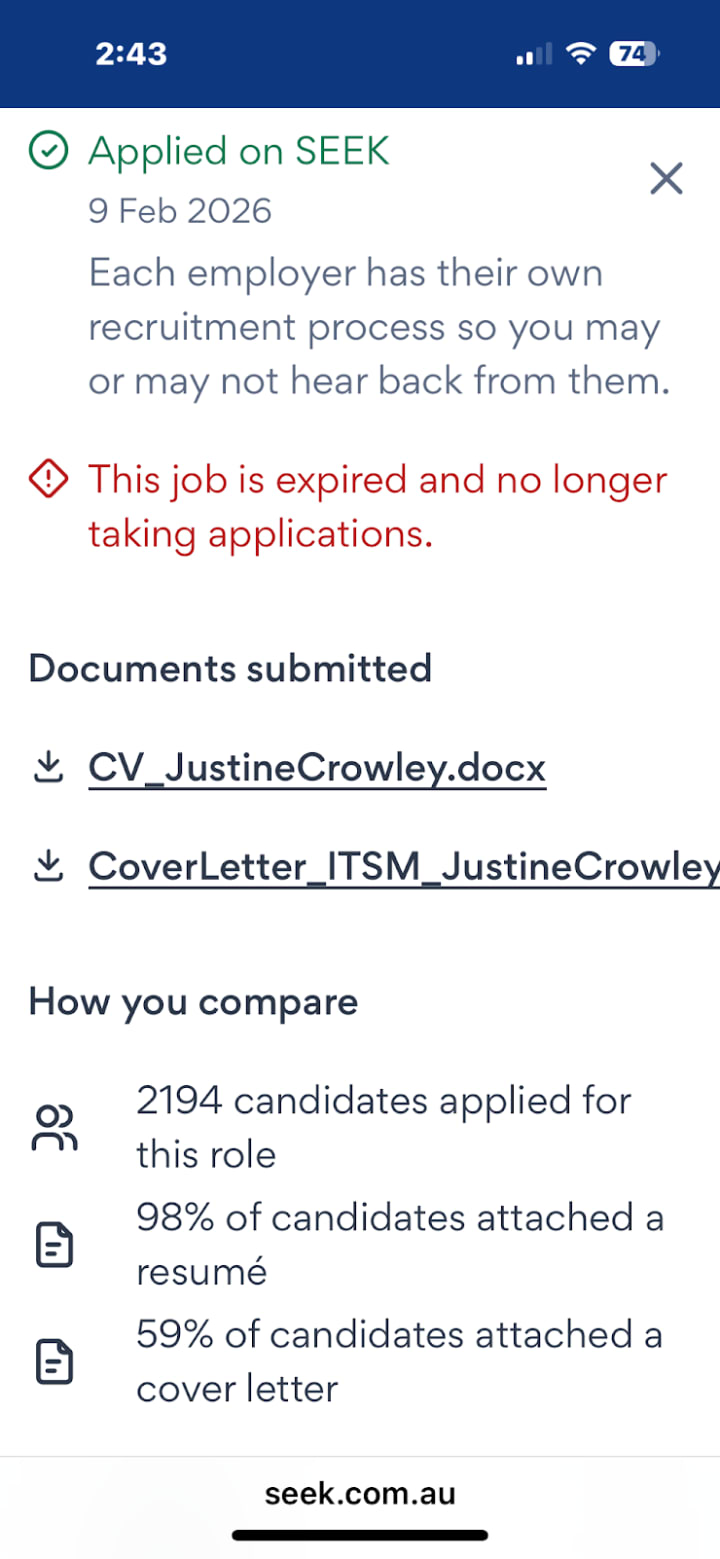 There are a number of economic and geopolitical factors that come into play in causing this trend. The hiring managers are usually the successful candidates direct report, rather than HR departments due to automation and cost cutting initiatives. This means that strong applicants with the right qualifications, skills and experiences get screened out and rejected through no fault of their own. Below are screenshots of two jobs that yours truly has applied for this month. With the job with over 1,000 applicants, and less than 2,000 applicants; that role is a casual after-hours position where the hours to be worked are unclear.