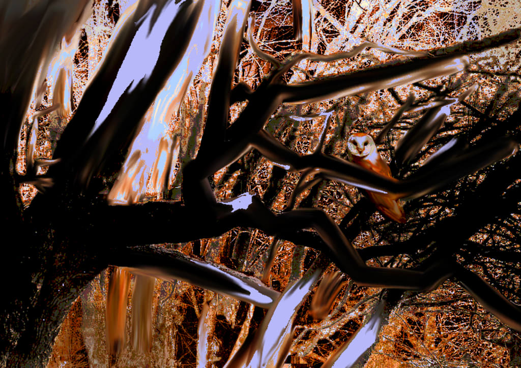 The walls were decorated with a multitude of owl-based art; sculpted and painted and even sketched on napkins. She especially loved this particular corner, with its mural of a moonlit forest, a barn owl tucked into the foliage inconspicuously. Sometimes it was so hard to find, she was convinced that the artist snuck in at night to move it. Julie loved it.