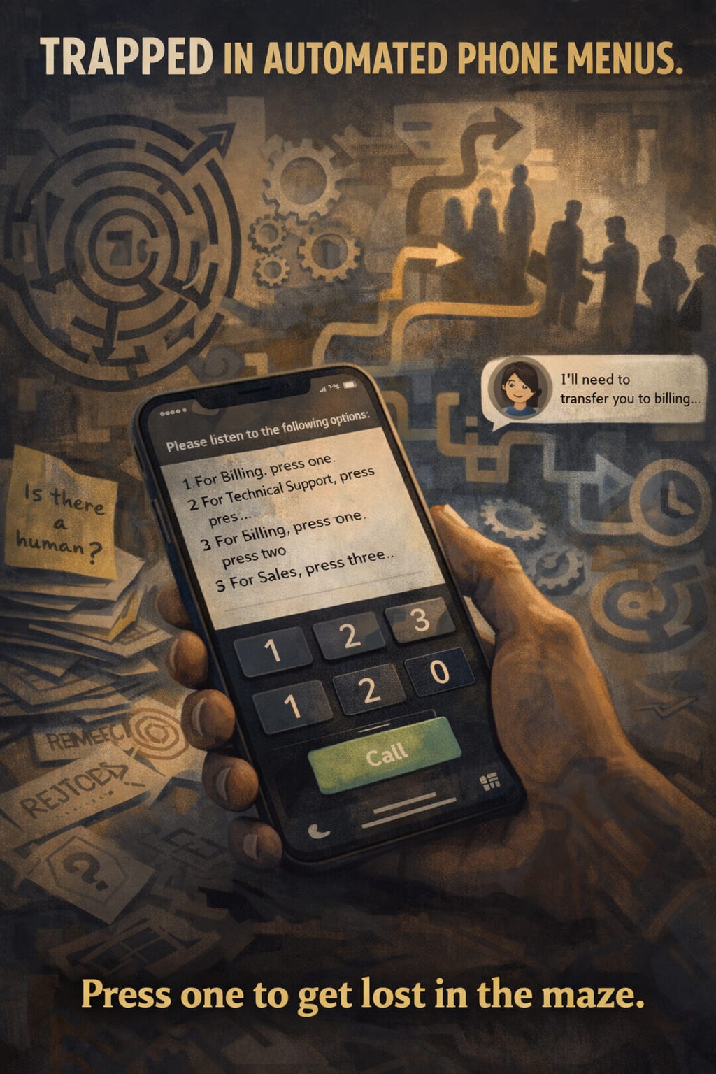 That's what we do. We adapt. We build workarounds. We buy backup generators. We get second phone lines. We learn the shortcuts. We learn which buttons to press to skip the menu. (Spoiler: If you press zero repeatedly, sometimes it forces a human. But not always.)