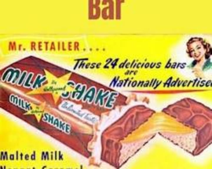 Milk Shake Candy Bar: This unique candy bar featured a milk chocolate coating over a vanilla-flavored nougat center with marshmallow creme stripes. It offered a sweet and creamy taste that was reminiscent of a milkshake. Discontinued in the 1990s.