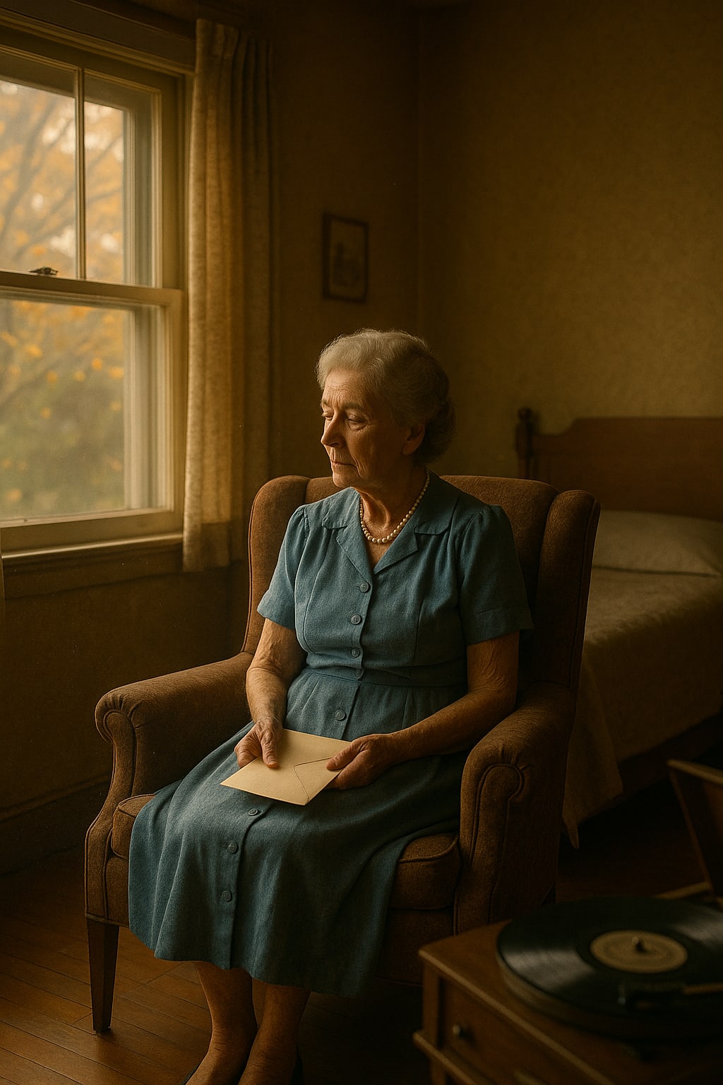 They found her in her chair, the record still spinning softly. Her dress was ironed, her hair neatly done. Her pearl necklace gleamed under the lamp.
