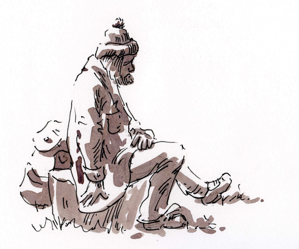 Daily sketch Something new, remembering that his daughter was married for a second, thinks nobody knows this. I used to be a renowned math engineer, now nobody recognizes me. If only my students could see me now, they would never believe that one of the smartest men alive is a drunk older man living on the street. The time goes flying; sometimes, he remembers Mia and wonders how she's doing. Probably she is still angry with me; maybe I was too abrupt with her. The sun begins to disappear and slowly becomes darker, and for the first time in years, he goes to sleep without drinking a sip of alcohol.