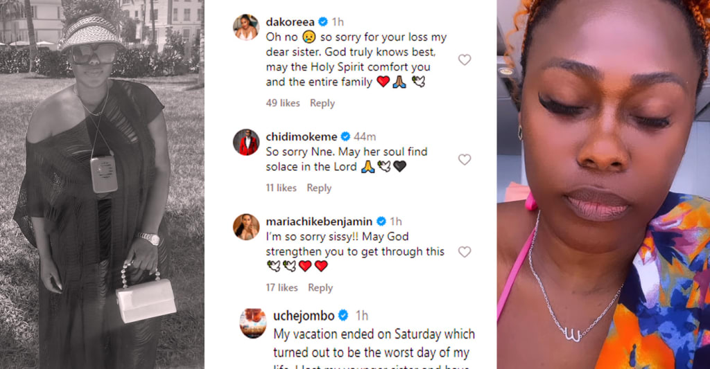Taking to social media, Uche Jombo revealed the passing of her younger sister writing: