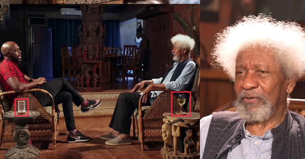 During the interview, the interviewer pointed out that Wole Soyinka wasn't drinking water and sent away the water brought for him saying "I am drinking water, you are drinking wine, and you sent away the water," to which Wole Soyinka replied: