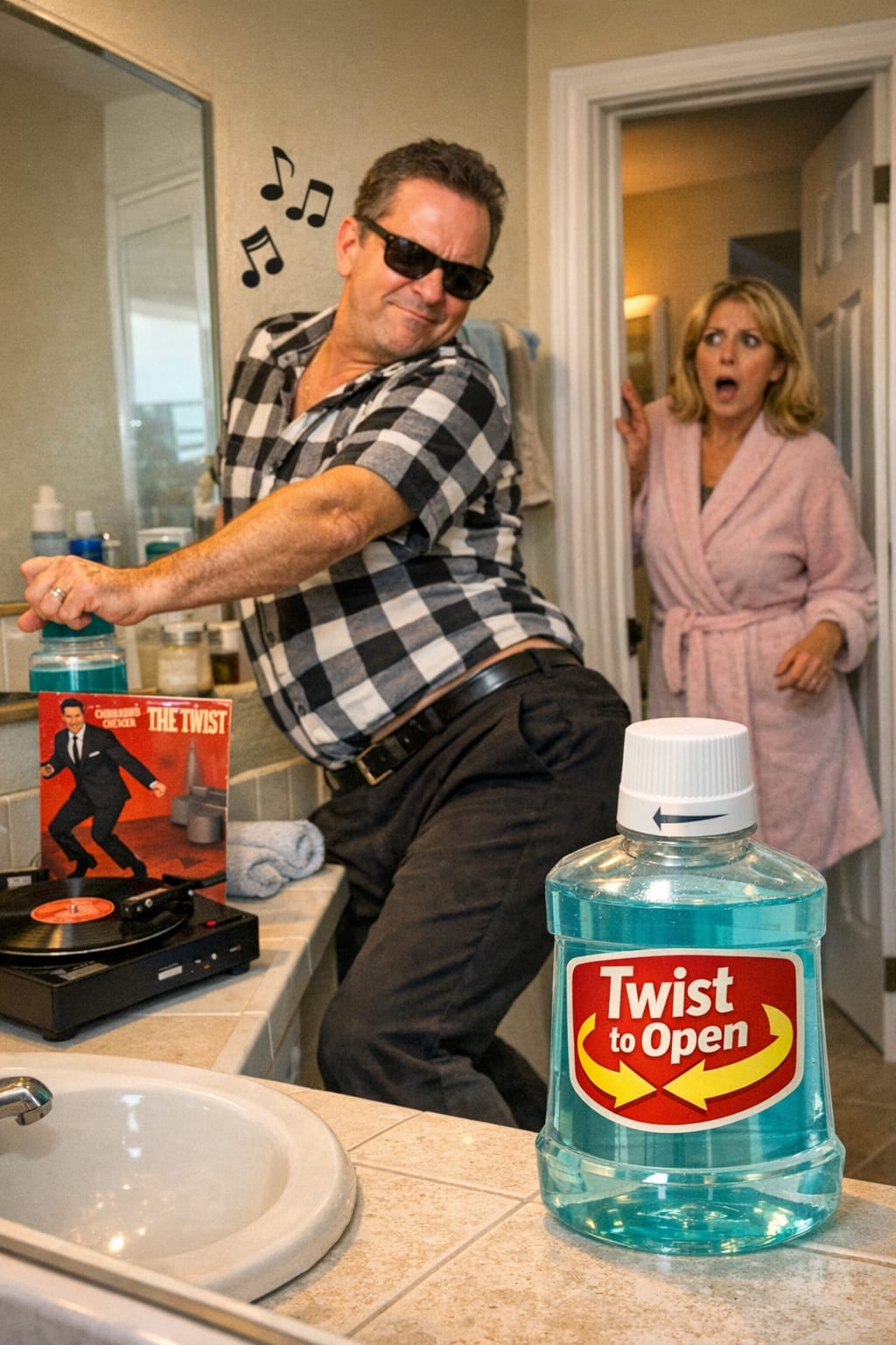 Picture this... A husband stands before the sink holding a new bottle of mouthwash. He reads the instructions. He nods solemnly. He places the bottle on the counter. Then, because he is a man of integrity and of honor, he begins to twist. Not the cap. Himself.