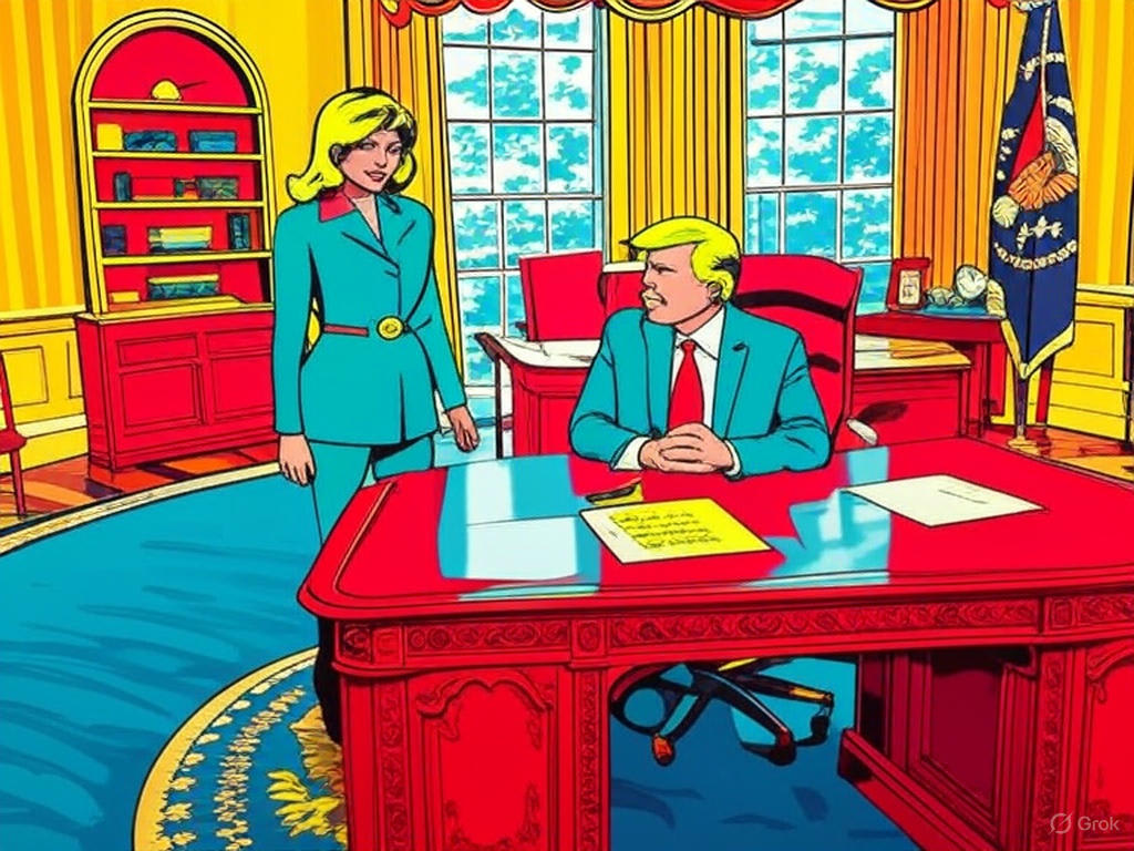 Spotting Natalia’s perky posterior hop into the Oval Office, Melania sprints and sweeps in behind, arms laden with shopping bags. “Give us a minute, Natalie,” she purrs, then elegantly slams the Oval Office’s ordinary white door shut in Natalie’s honey blonde face. Platinum blonde is a far more elegant hair color.