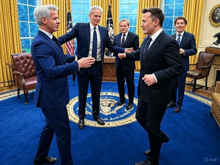 Talon Musk, Will Flackman, Felix Jones, Scott Bessent, Peter Navarro and Natalia Harp, erupt in synchronized sycophancy, “I fully support your decision, Mr President.”