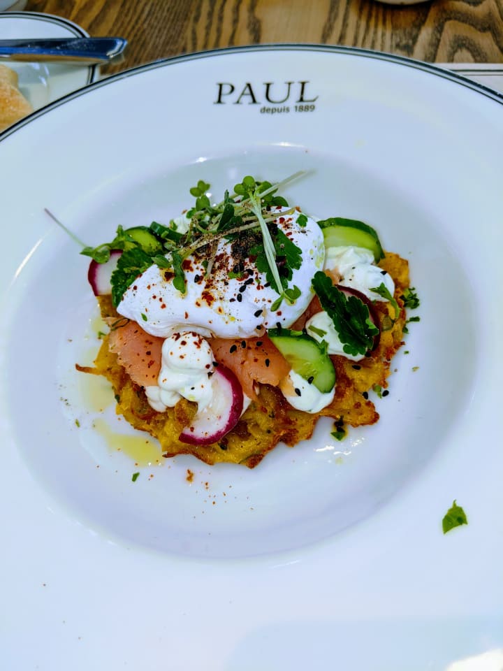 I was enjoying myself so much that I decided to treat myself to a special lunch. We had recently eaten at a Paul restaurant at the Port Baku Mall. Paul is a French chain of bakery/café restaurants. It specializes in serving French products including breads, crêpes, sandwiches, macarons, soups, cakes, pastries, coffee, wine, and beer. Paul belongs to Groupe Holder, which also owns the French luxury bakery Ladurée. They have locations in 27 countries. The only way a restaurant chain has that type of longevity and global reach is with great food or cheap food and golden arches. No cheap food or golden arches at Paul (though it is reasonably priced). When we were there, I saw an item on the menu that I had to have, a latke (potato pancake) with smoked salmon, a poached egg and crème fraiche dressed out with pickles and greens. It looked gorgeous. But they had just run out of the fixings and I had to have something else. I had been thinking about that latka ever since we ate there. Paul has another location in Torgovaya, much closer to our apartment; a slight adjustment to my walking route soon had me sitting in the Paul French café.