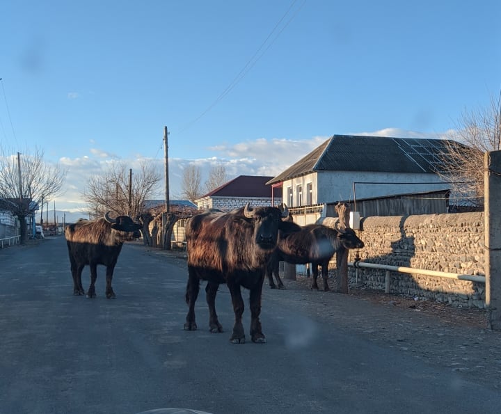 At least we were moving again. Our driver did his best to make the ride through the countryside as thrilling as possible. He was speeding, driving all over the road and texting while he was driving. And, of course, we were back in the land of the serpentine road. He did us a favor and slowed down when we came up on livestock strolling down the road. In rural Azerbaijan, sharing the road has nothing to do with bicycles. He was kind enough to stop so I could take a picture of a group of oxen who were walking in the middle of the road through a very small village, but I don’t think that he had much of a choice in the matter.