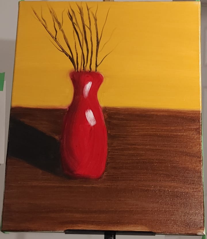 I've been "studying" (for lack of a better term) oil painting (alla prima) and started with landscapes. I've also found a big interest in still life and am trying to find ways to do both in the same painting. It can be tough to put on to canvas what I'm seeing in my mind. Sometimes it works, and when it does it works amazingly! But when it doesn't, it's a hot mess!