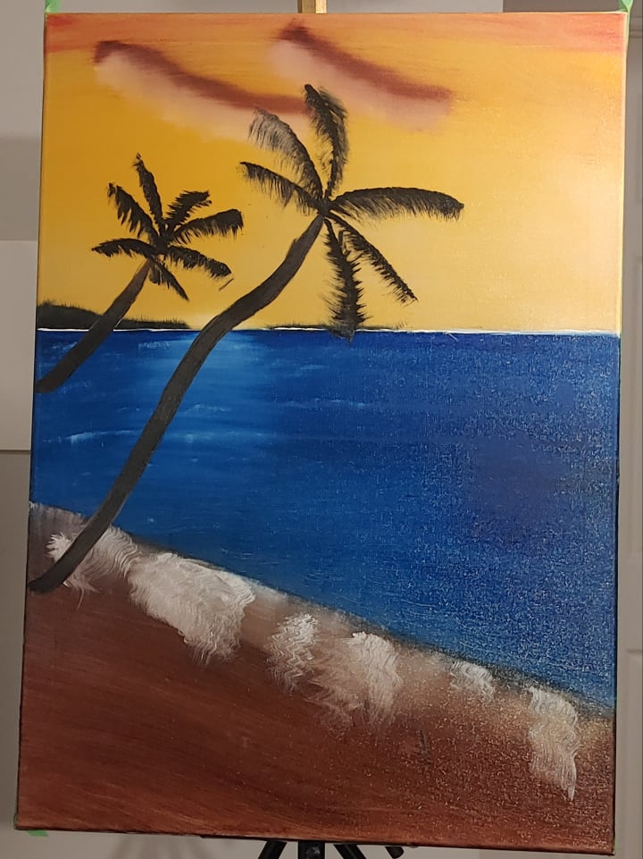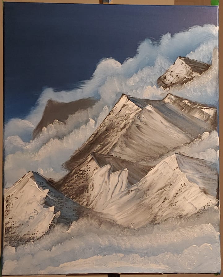 A: Often times it's something by Bob Ross or Bill Alexander. Bob was amazing at landscapes, but Bill Alexander and the Alexander Art team were great at landscapes—florals and still life as well! I've spawned an interest in still life painting from watching Alexander Art videos. Other things that inspire me are the many talented artists on Reddit. I'm very active on the r/Painting sub-reddit or a phrase may have heard. I made a video titled "Celestial Shore" and a video titled "Magic In The Mess". Also, it's just the surroundings of places we've been. There really is beauty and inspiration everywhere! I've really "opened" my eyes since painting!!