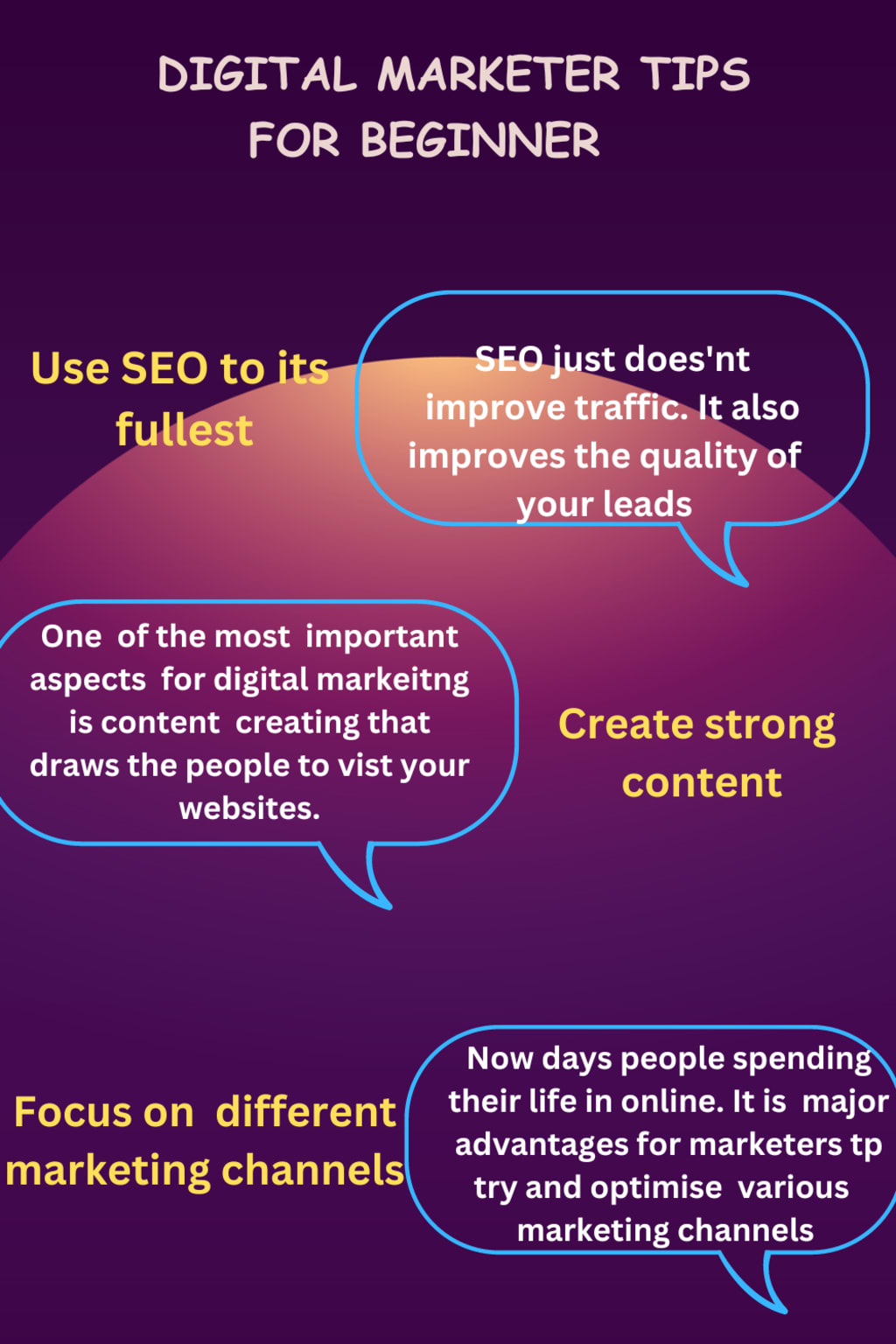 A digital marketer's role is to drive a brand awareness and then ruling generations through digital channels mostly digital marketers spend their time by creating posters and creating valuable content, and then controlling social interactions. For example, a digital marketer in charge of SEO (SEARCH ENGINE OPTIMISATION ) means they might improve website ranking on major search engines like GOOGLE, YAHOO , BING. etc and then all digital channels - both free and paid.