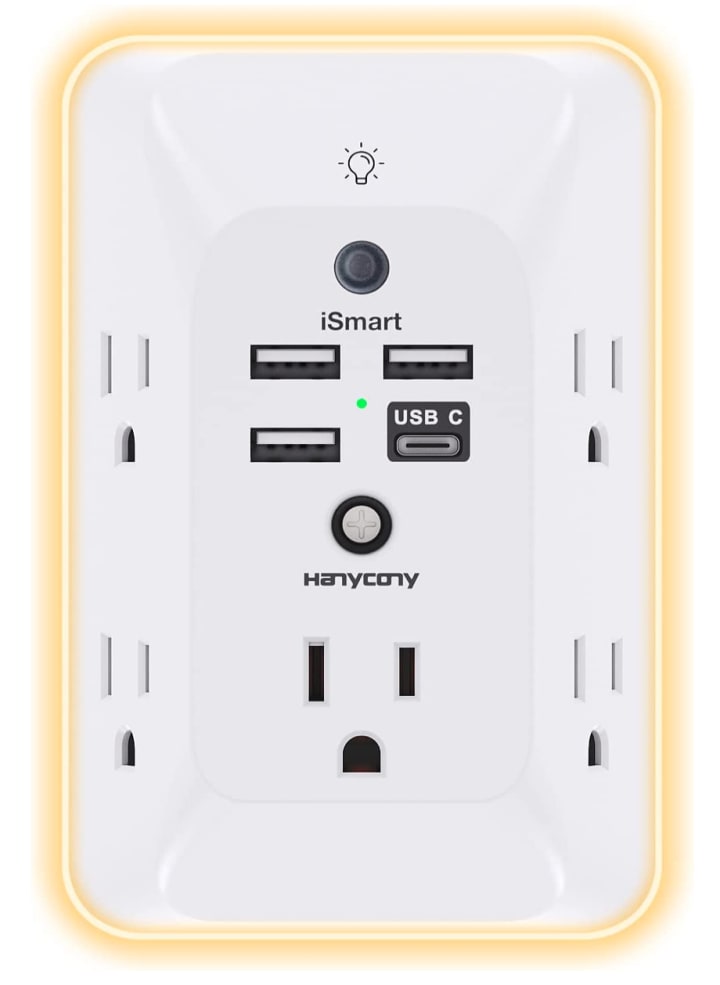 The Outlet Extender with Night Light is a versatile 10 in 1 gadget that offers multiple features to help you keep your devices charged and organized. It includes 4 USB charging ports, 5 wide-spaced outlets, and 3 side power strips, which provide large space and save you another charger head space. With the 360° night light feature, you can easily see the outlets in dark corners or at night. Additionally, the gadget features a smart and soft night light, which turns on only when ambient lighting becomes dim, and you can also choose to turn it on/off manually. The gadget also offers USB C Fast Charge & Wide Space, with 1.7 inches of large space between 5 adapter outlets on the side that can easily fit big head chargers. The 4 USB ports total 3.1A, and the USB C ports have built-in smart technology that can detect and charge your devices quickly, up to max 5V/3A, compatible with most type C devices. It is important to note that the UCB-C port doesn't support any other devices that need 14~22V charging voltage. The Outlet Extender with Night Light also features a surge protector outlet, with 3 complementary surge protection circuits (TVS, MOV, GDT) that have a response speed of less than 1Ns, and a minimum energy-absorbing capacity of 1050 Joules, much more quickly and reliably than traditional MOV surge protector circuits. The "SURGE PROTECTED" indicator light shows that your devices are protected. Lastly, the Outlet Extender with Night Light is ETL certified and offers super safety features, including overload protection, short-circuit protection, over current protection, over-voltage protection, and overheating protection. It will automatically cut power to protect connected devices when voltage surge is overwhelming, ensuring the safety of your devices.