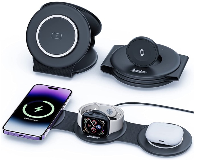 The Travel 3 in 1 Charging Station for Apple Magsafe Charger is a highly versatile wireless charging station that can charge multiple devices at the same time. It is designed to eliminate cords and create a tidy and neat charging space for your home, office or meeting room. The charger is compatible with Apple Magsafe Charger and can fast charge iPhone 14, 13, 13 Pro, 13 Pro Max, 12, 12 Pro, 12 Pro Max, and 11. The charger features strong magnetic snap that aligns the wireless charging coil for fast and stable charging. The portable and foldable design of the charger makes it a perfect travel essential. The charger is exclusively designed for wireless iPhone charging and has raised the height of the charging pad to avoid camera damage or intermittent charging caused by a space between the charger and the phone. The Travel 3 in 1 Charging Station for Apple Magsafe Charger is a great gift choice for both men and women.