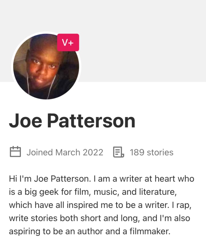 Hi I'm Joe Patterson. I am a writer at heart who is a big geek for film, music, and literature, which have all inspired me to be a writer. I rap, write stories both short and long, and I'm also aspiring to be an author and a filmmaker.