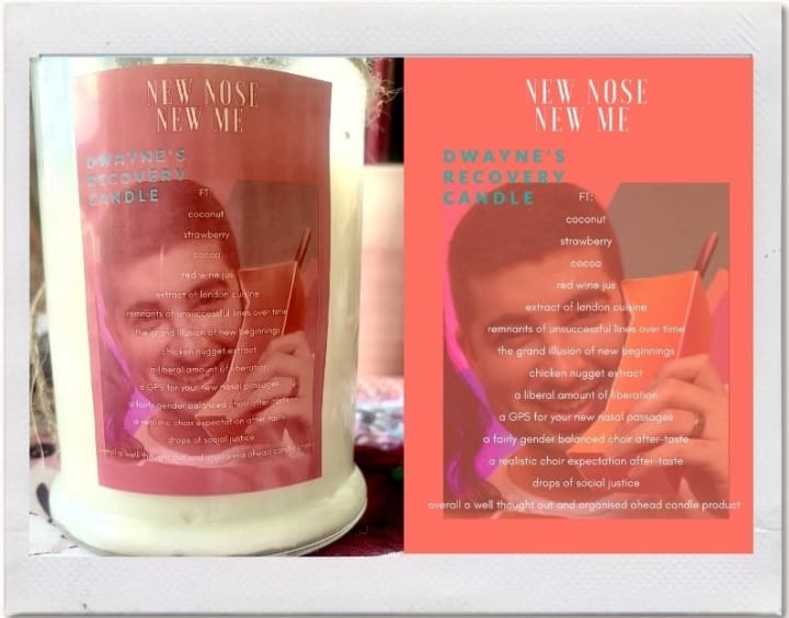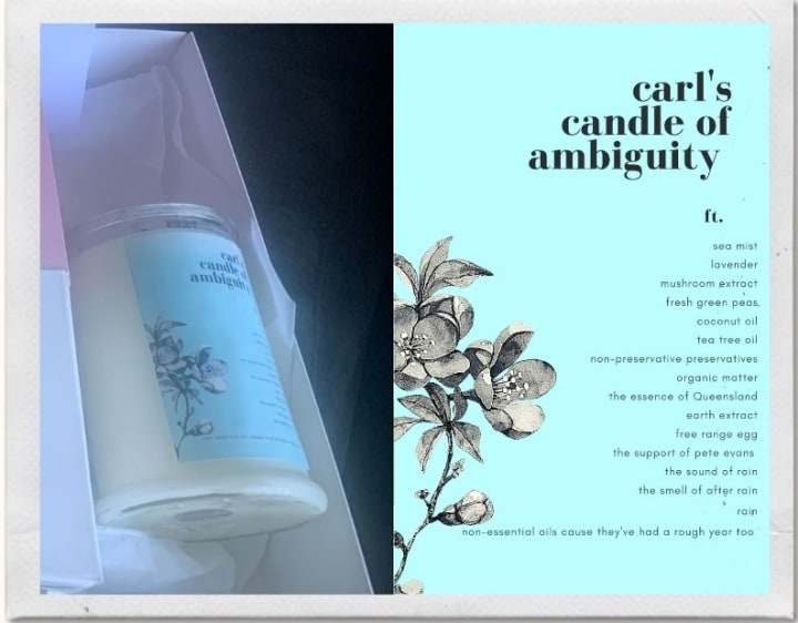 A good friend Carl, is known for his holistic preferences and quirky habits. With the goal of making a candle he would love whilst also wet himself, I used my graphic design software and sticker printer to whip up the following label: attached to a homemade candle (that only includes the first two scents.)