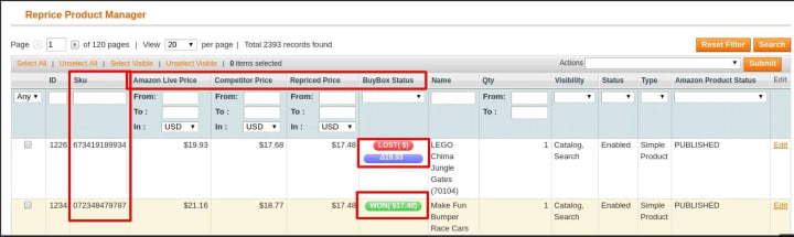 - The green color shows the Buy Box status, how a seller once lost a buy box for one product but won for another.