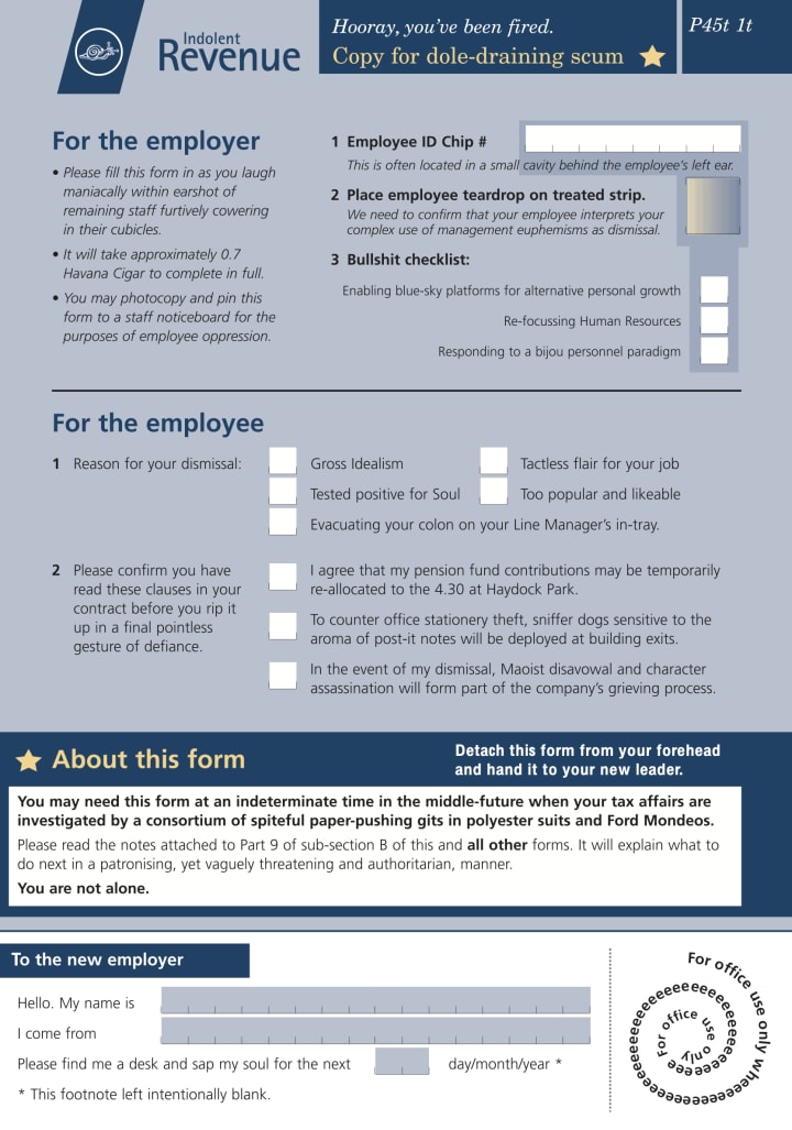 I henceforth resign not from a job, but all jobs. It has become impossible to navigate the world at these rates of pay, especially when one ends up giving most of it to one’s pencil-faced landlord in return for a tenancy of quiet oppression and magnolia walls. All of us work more hours than we should to feed, house and clothe ourselves, so someone else is accruing the fruits of our labours. For food, I will hunt and gather and farm; for shelter I will live in the woods and for clothing… well, for clothing, I have also taken it upon myself to resign from public decency. This will distress many of you, but you cannot oppress a naked person – not without wearing nitrile or washing-up gloves.