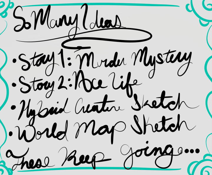 I must block out those blocks. Write out all my thoughts and ideas. Sketch down all the images that pop into my rambling little brain. I may not be able to finish them all. That doesn't mean I won't try. Whenever I find myself at a block, I try to find ways to break past it and that is one of those things. Jot things down or quickly make a few odd looking designs.
