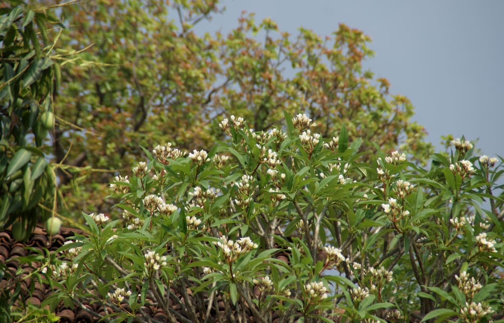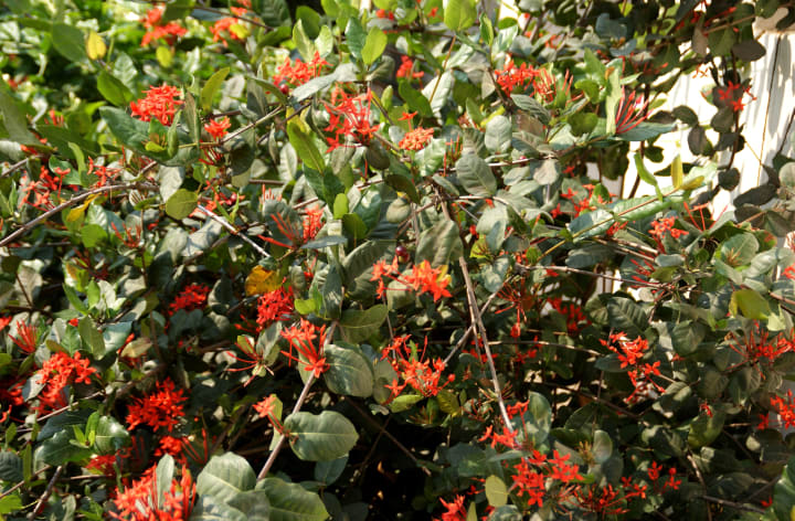 The bougainvillea, ixora, night jasmine, passion flowers, coral jasmine, Arabian jasmine, tuberose, dahlia, chrysanthemum, plumeria, hibiscus, rose, Rangoon creeper, and flaming glory bower graced the yard.