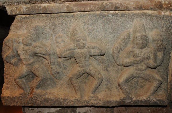Some of the 81 dance positions carved on the outer wall of the upper storey corridor wall.