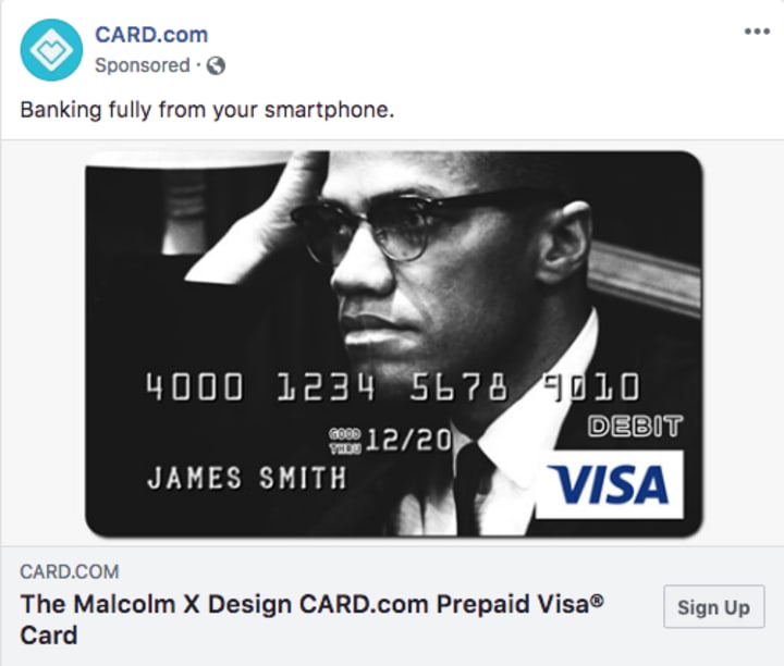 Now, even from an admittedly outsider's perspective, Malcolm X is certainly one of the most influential voices in the history of the civil rights movement and in the history of the Black American community. And so, from a branding and marketing standpoint, I do find it simply amazing—and in point of fact, quite troubling—to think that businesspeople would, in 2019, think that it is a good idea to use Malcolm X imagery to market a debit card predominantly to the Black market.