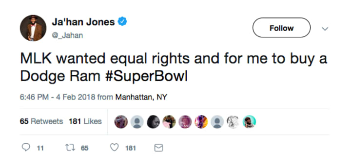 While the adage may hold that "there really is no such thing as bad publicity," the Dodge ad immediately sparked a harsh response from the Black community and yes, significant numbers in both the general public and in the advertising community. It was perceived by many as perhaps being "a bridge too far" in terms of having the civil rights icon apparently posthumously endorsing pickup trucks! As one Twitter user encapsulated the situation perfectly: