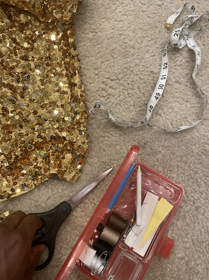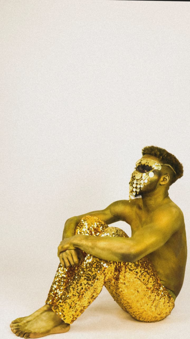 Each chapter would illustrate a specific part of my being that works daily to influence who I am. I’m producing and demonstrating these wells of my being are through original poetry, fashion-forward visuals, and handmade garments from myself and other black-owned companies. Starting this project straight out of a pandemic was extremely challenging because I had big dreams and expectations of myself with little to no money. I tried getting two jobs but, that was short lived because I couldn’t maintain my desired academic-standing and balance two jobs and a demanding personal project. So, I kept one of the jobs and made due with what I could. Chapter One explored what SELF/Worth meant to me and how it’s not based on what others think of you or the things you have (or haven’t) accomplished. It comes from within. The fashion forward concept I meshed with this self-well was “Being consumed by the King Xerxes”. Xerxes is illustrated as the King of Gold. So, I decided to hand paint my entire body gold and dye my hair dark golden. I was able to borrow a gold face chain from my friend but when it came to the pants, I had to get creative.