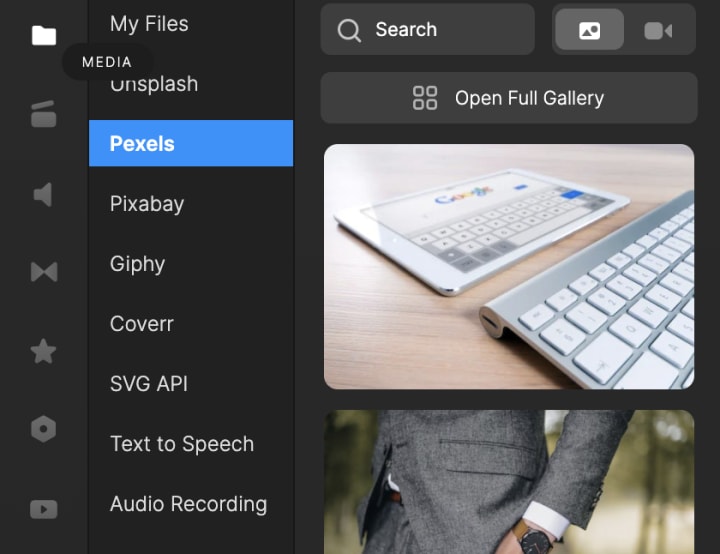 CreateStudio provides the ability to bring in media from multiple sources like Unsplash, Pexels, Pixabay, Cover, and more than thousands of SVG's from the SVG API integration. Additionally, its Text To Speech integration makes it easy to craft voice overs by inserting your desired text or you can even record your own voice right inside the project.