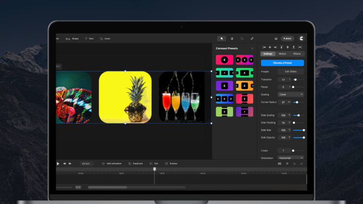 Use carousels on their own or as part of an animation or video. Easily add multiple items to your carousel using the user-friendly drag-and-drop interface. With the Carousel Creator, you’ll be able to craft the ideal carousel for your business in no time.