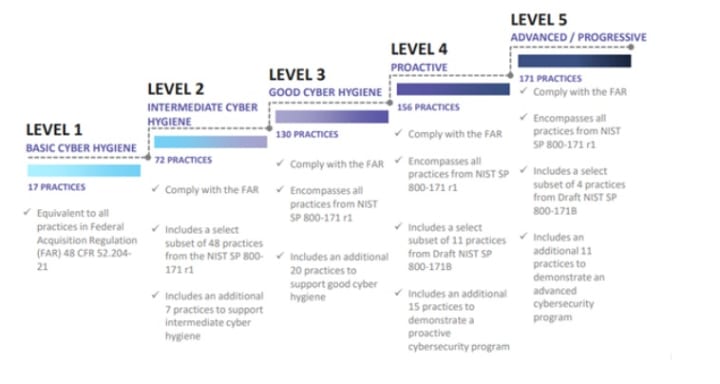 The CMMC framework establishes five certification levels with a defined security posture or maturity level an organization must achieve, determined by the sensitivity of the information they handle.