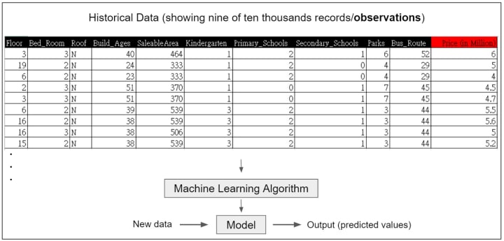 Here is a use case for predictive analysis. The property prices are determined by many factors. The factors may be the location, age, transportation, etc. By collecting those factors and the corresponding property prices, a model for predicting property prices can be generated. That means anyone can predict the price of a property based on the current factors for feeding to the model generated by machine learning.