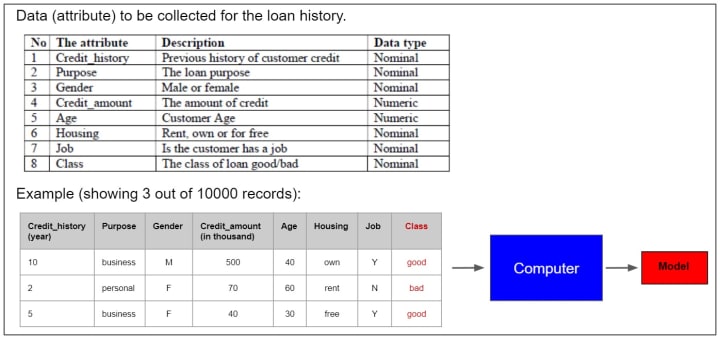 Here is another example of machine learning. To build a model to predict whether granting a loan to the customers, you need to extract some historical data about their loan history from a bank’s database. What data would you extract? You may consider collecting the data (attributes) below from every applicant. A model can be generated by applying the right machine learning algorithm. Once the model is ready for use, you can easily decide whether to grant the loan based on the same set of data (attributes) submitted by the applicants. You may ask whether this kind of prediction is accurate. Its accuracy depends on the algorithm selected and the quality of the data collected. At least human judgment can be complemented by the prediction.