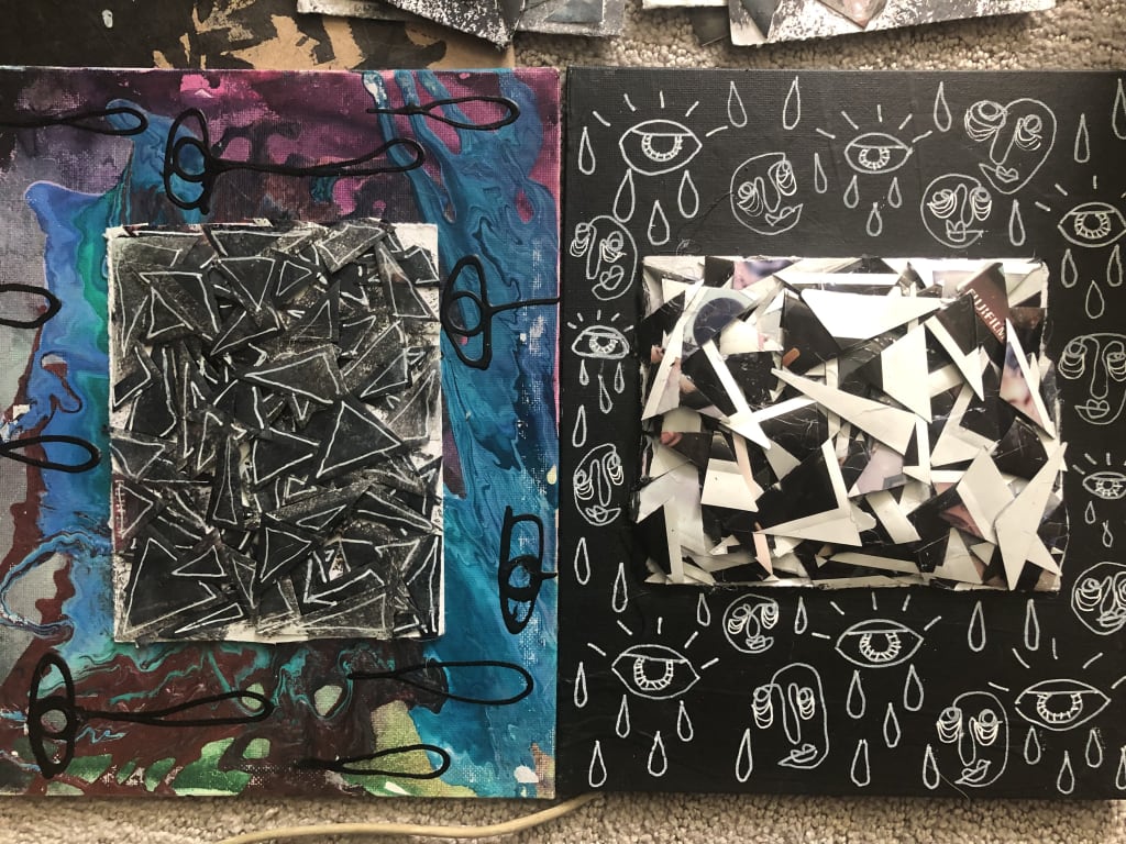 I’m in between therapists right now and felt very judged for expressing myself. I don’t think she knew how to deal with someone so riddled with mental illness, but I get it, I have a really hard time doing that too. But I’ve taken out those pieces of cut up polaroids again and have used them in my art. My current series of pieces I’ve been working on has been about healing with the relationship I lost after the psych ward and all of the ones before. I took the pieces and glued them to a canvas of old art I wasn’t very happy with. I had to create by destroying. I had to rise from the ashes like a phoenix emotionally and artistically. I decided to cover them with acrylic paint so I couldn’t see them anymore. So I couldn’t dwell on them anymore. So I couldn’t go back to all of those feelings. I cried. I needed to take breaks. I had to deal with very tough questions within myself. Why did I keep them for so long even as I was moving from Chicago to the California suburbs? I made the choice to keep these. Why? Was it because I couldn’t let go of him or was it that I couldn’t bear to part with a part of me that was so happy? Did I want to keep dwelling on questions that will be forever unanswered about that last tough breakup? I didn’t have all of those answers. I’m not sure I ever will. As I cry writing this I had judgemental thoughts about getting so emotional but I guess that's another step in the healing process. But these pieces are for me and don’t need to be understood by anyone else but me. I’m not done with them yet, but I don’t think I’m done with healing yet either. But that’s the beauty of it, right?