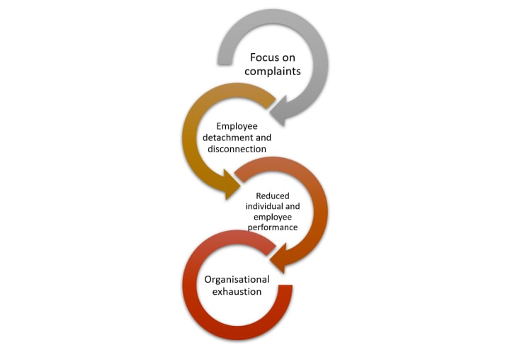 As the research clearly shows, an uneven focus on complaints means that you are not only hurting your staff, you are sacrificing organisational performance in the process. Sure, some focus on customer complaints is required to ensure the best possible products and service is delivered to customers. However, concentrating solely on complaints creates a disturbing downward spiral of detachment, disconnection, reduced individual performance, reduced organisational performance and ultimately organisational exhaustion.[1].