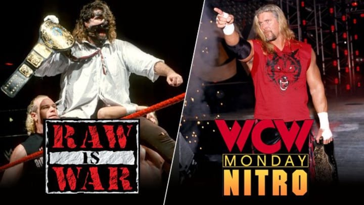 ABOVE: The Monday Night Wars, as it was called. WWE (Raw Is War) vs. WCW Monday Nitro lasted from 1995 to 2001. WWE would become the winner, eventually buying WCW | Img: Kayfabe News