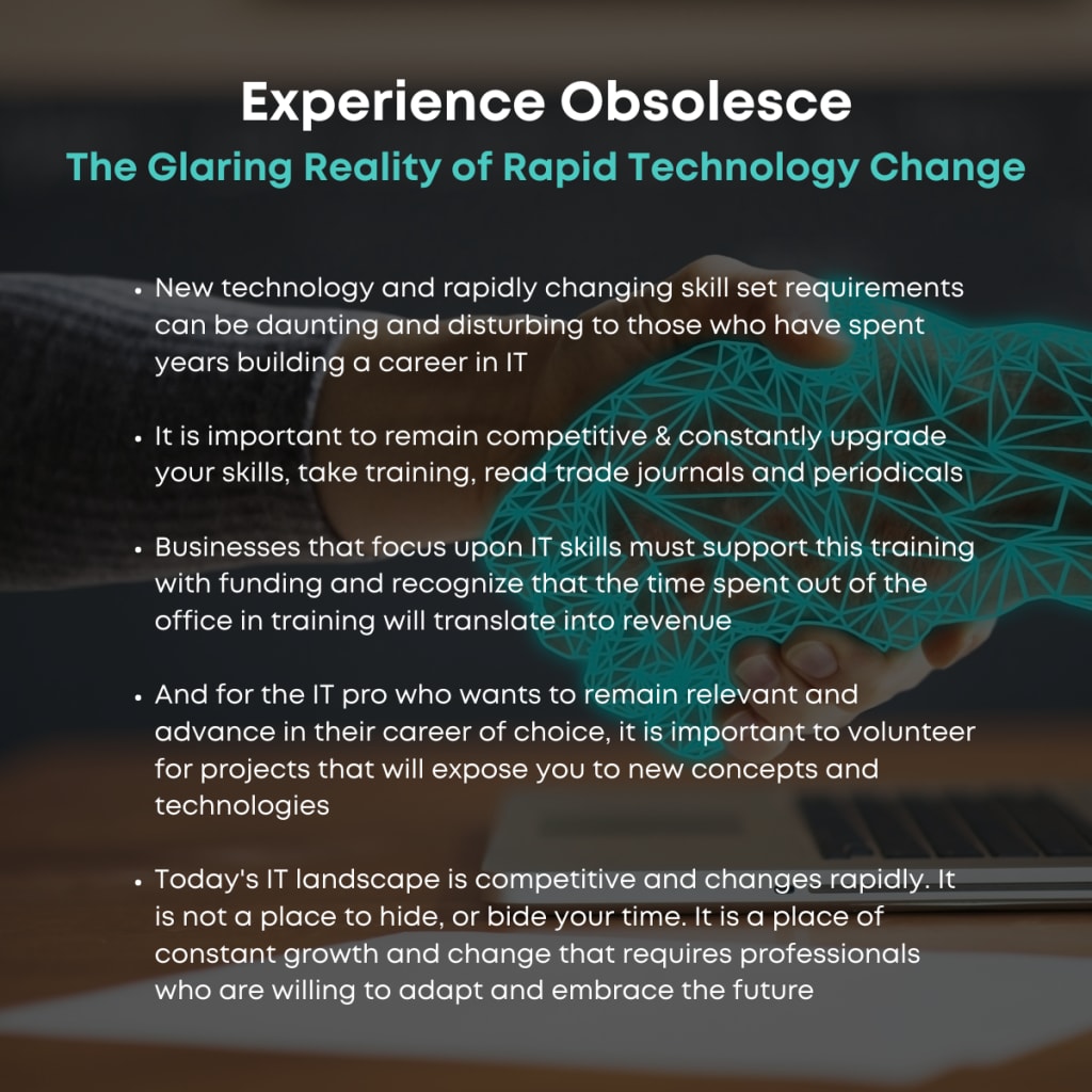 Today's IT landscape is competitive and changes rapidly. It is not a place to hide, or bide your time. It is a place of constant growth and change that requires professionals who are willing to adapt and embrace the future.