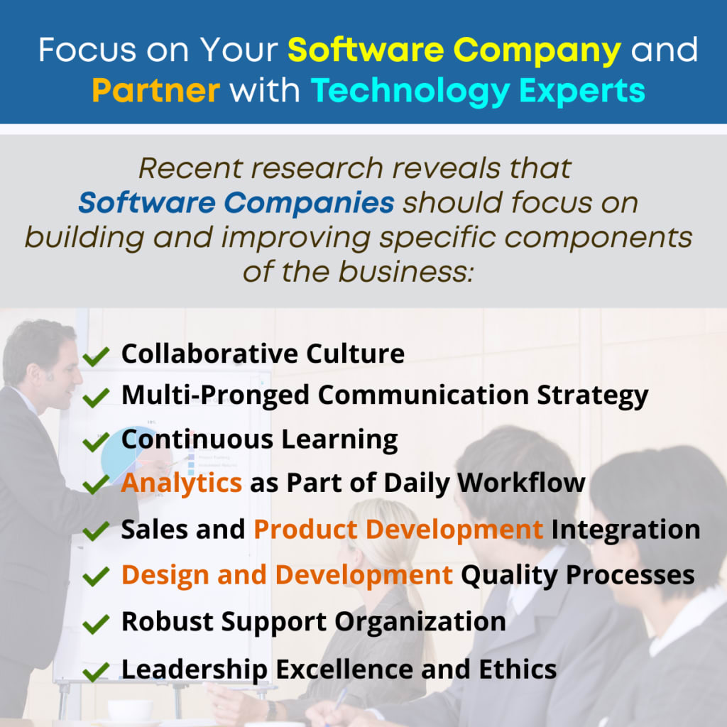 Every manager, executive and team member within a software company will tell you that the breadth and depth of skills, experience and business processes required to run a successful software company is complicated. Your focus should be on your core capabilities and on your clients and users. And, while you may have a firm grasp of your products and services, you may also struggle to stay abreast of new technologies and to train your team and provide enough resources to continuously develop new and improved products and services that will satisfy your customer and market needs.