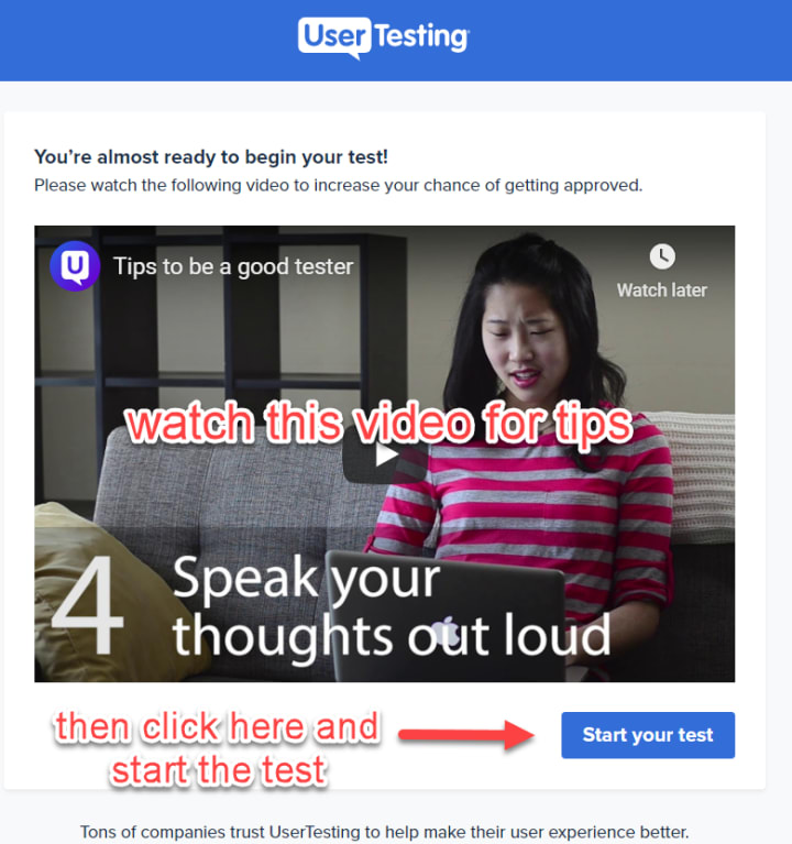 After clicking the link in the email, you will be taken to their signup page. You will first be greeted by a page that explains how to become a good user tester. I strongly recommend you to watch the video to understand what they will be expecting of you.