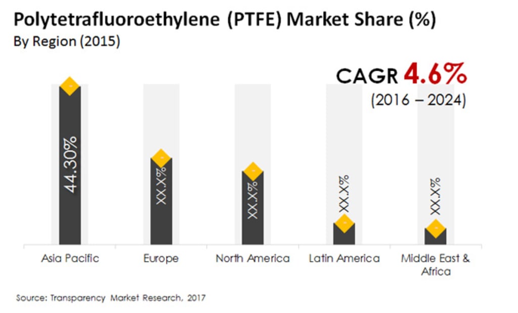 Polytetrafluoroethylene (PTFE) Market (Product - Granular, Fine Powder, Micro Powder, Dispersions, and Liquids; Application - Industrial and Chemical Processing, Automotive, Electricals, Electronics, Cookware, Building & Construction, and Medical) - Global Industry Analysis, Size, Share, Growth, Trends and Forecast 2016 - 2024