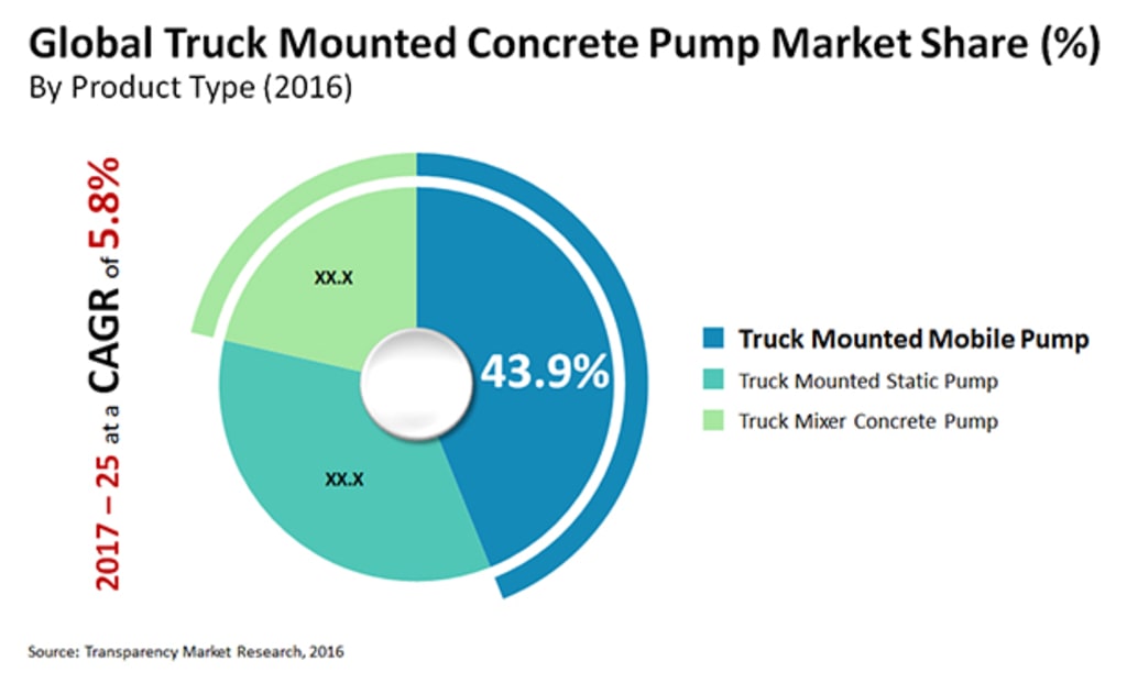 It is estimated by TMR that the world truck mounted concrete pump market will show a 5.8% CAGR between 2017 and 2025, rising from a valuation of US$2.79 bn in 2016 to US$4.64 bn by 2025.