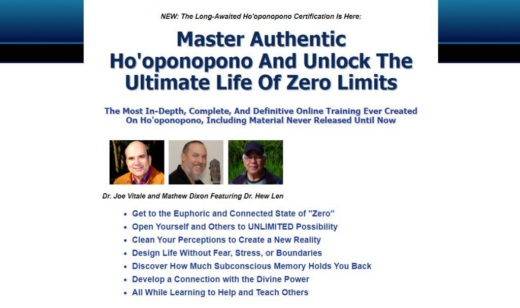Ho’oponopono Certification Course is an online training program created on Ho’oponopono that includes material never released until now. The Ho’oponopono Certification program was created by Dr. Ihaleakala Hew Len and Dr.Joe Vitale, a licensed psychologist who has been practicing Ho’oponopono for over 25 years. He’s helped thousands of people heal from physical and emotional problems using this simple technique. It is about unlocking the ultimate life of zero limits on getting to the euphoric and connected state of zero. The course will help you start self-healing. Then, you’ll start attracting more people who need your help as a more positive person. This enables you to grow spiritually and emotionally though your own efforts to develop your personal self. In essence, it will help you clear your mind on a subconscious level. This will help you to reignite the positive energy that may have been present in your life before. Transform your life from within by learning how to cleanse your mind and remove all mental blockages. Once free of these limiting mental obstacles, a person can flow forward in their journey toward their goals.