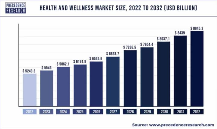 According to precedence research in 2022, the global health and wellness market had a valuation of USD 5,243.3 billion. It is projected that by 2032, the market will surpass USD 8,945.3 billion, experiencing a Compound Annual Growth Rate (CAGR) of 5.5% during the period from 2023 to 2032.
