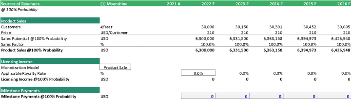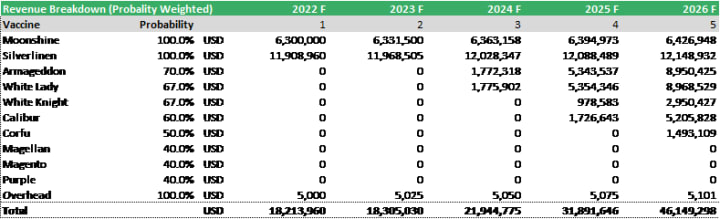 As you can see in the table below, per product revenue is probability weighted. It captures the risk per product depending on their phases. Since revenues are breakdown per product probability, the projection is more accurate and reliable.