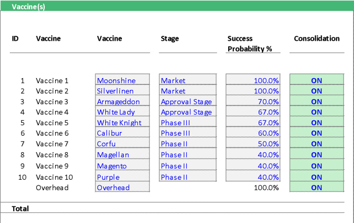 The table below is a sample list of vaccines with their corresponding phases of development, success probability, and on/off mechanism for consolidation. We will discuss success probability and on/off mechanism for consolidation in the next subtopics.