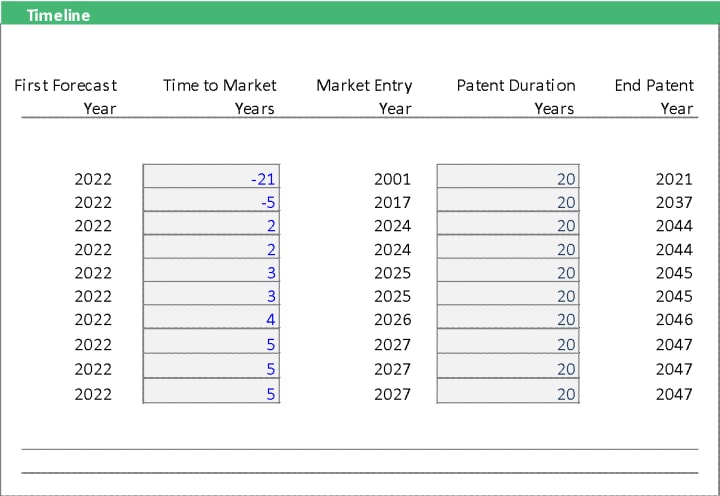 In the timeline section of your pharma or biotech project analysis, you can input the number of years when some products are already out in the market and the projected year of products in development phases. The timeline also shows the patent duration and when it will expire. It will help you assess the timing and project the decrease in prices and production volumes once the patent expires.