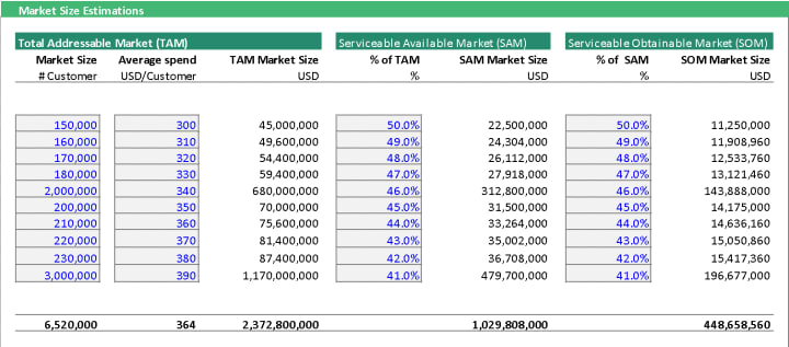 Identify your target market – the demographics you cater to, location, and needs of your prospective customers. You can then multiply the number of target customers by the average spend per customer to get the Total Addressable Market (TAM). Out of the Total Addressable Market, you can project a certain percentage based on your research and assumptions to derive the Serviceable Available Market (SAM). SAM is further classified into Serviceable Obtainable Market (SOM). SOM is the basis when projecting pharma or biotech sales. Shown below is the table for the market size estimation sample.