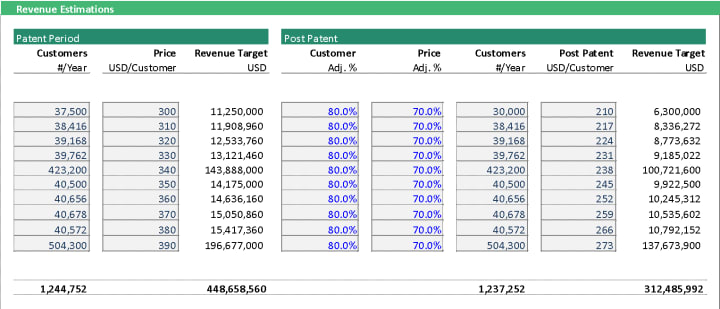 The table below shows the revenue estimations during patent and post-patent years. Post-patent has Customer Adjusted Percentage and Price Adjusted Percentage to capture the expected decrease in the number of customers and prices after the patent expires.