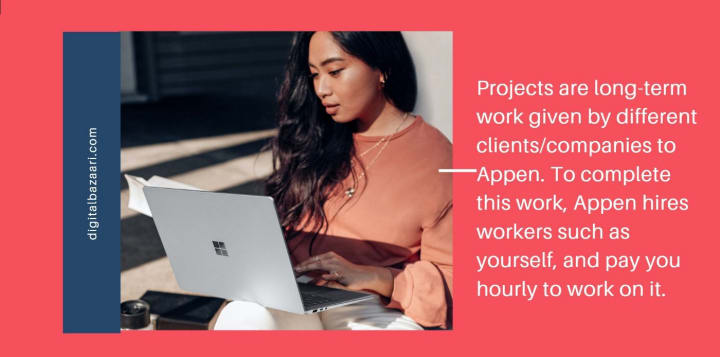 Projects are long-term work given by different clients/companies to Appen. To complete this work, Appen hires workers such as yourself and pays you hourly to work on it. The more projects you qualify for, the more work you have and the more earning potential you have.